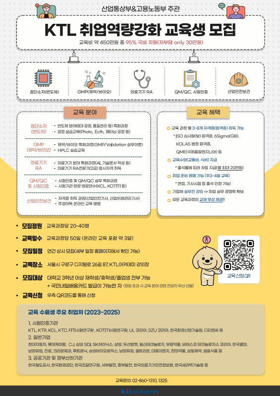 산업통상자원부 산하 공공기관인 KTL(한국산업기술시험원)에서 재학생 및 졸업생의 취업 경쟁력 강화를 위한 교육 프로그램을 운영하오니,